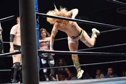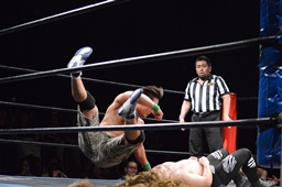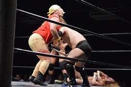 福田ビッグバンプ(右写真)。ココナッツクラッシュからニードロップ。ツヨーソ入ってダブルのクローズライン。