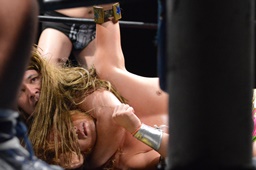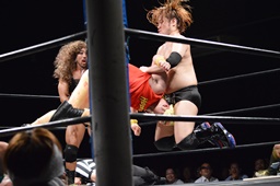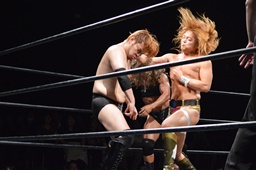 ツヨーソが福田にスリーパー(左写真)。福田立ち上がるとエルボーでブレーク、クロスボディを浴びせてハラ・シナにタッチ。