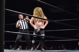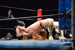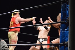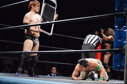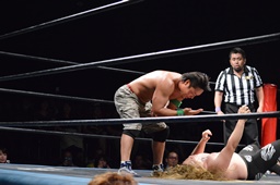 パーフェクトプレックス(右写真)、チョイナが松井レフェリーの足を引っ張ってカウント阻止。チョイナは福田にスタンガン、HHHHカバー、松井レフェリー戻ってカウント2。