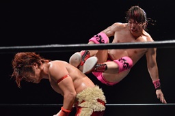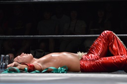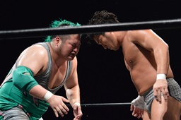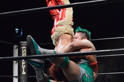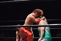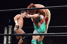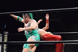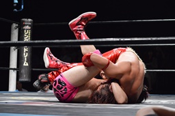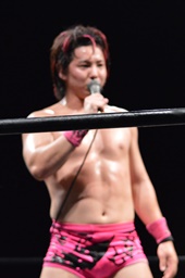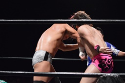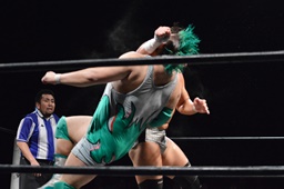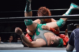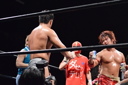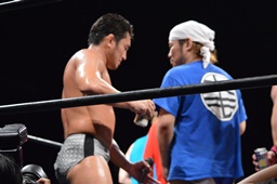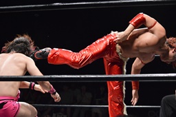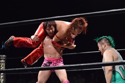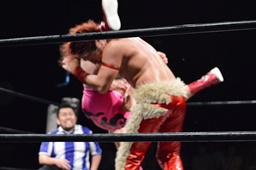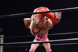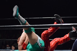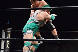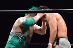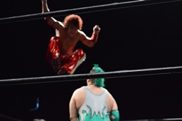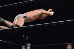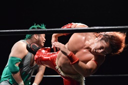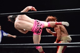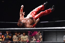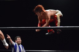 高尾シュバイン狙う、入江ブロックしてジャンピングブレーンバスター、カウント2。入江エルボー、コーナーに振って串刺しラリアット(右写真)。