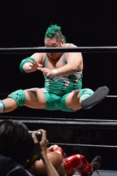 高尾コーナーに振る、入江切り返す、高尾カウンターのキック、コーナーに上って入江の背中にフットスタンプ、ドロップキック。コーナーに上ってミサイルキック(左写真)、カウント2。