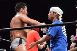 青木「お前らにありがとうとか言われる筋合いはないから。お前たちアジアタッグのベルト持ってて、次に変な奴らとやるんだろ?防衛しろ。もし防衛したら俺と諏訪魔で獲りに行くから。諏訪魔にも言ってないし、会社にも言ってないけど、予定調和嫌いなんで全部ブッ壊すから。お前らが防衛したら諏訪魔連れてきて挑戦するから。」(左写真)