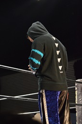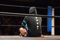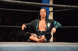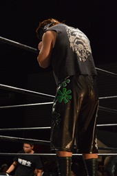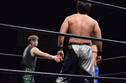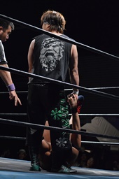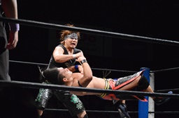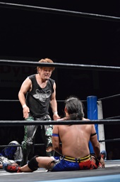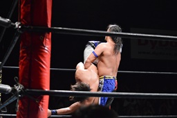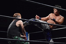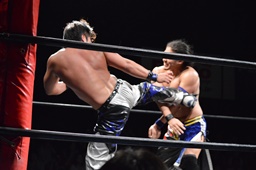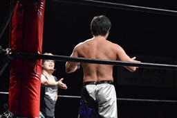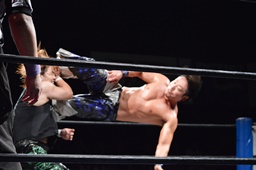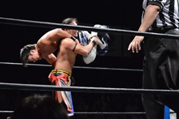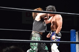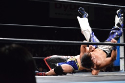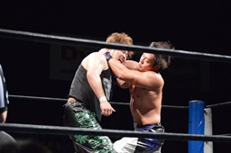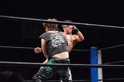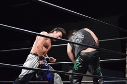 ロックアップ、彰人ヘッドロック、HARASHIMAロープに振る、彰人ショルダーブロック(左写真)。ウラノが彰人をスクールボーイ、カウント2。
