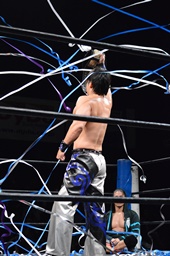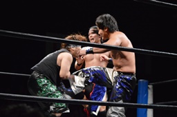 HARASHIMAと彰人ダブルのガットショット(左写真)、ダブルでロープに振る、ウラノかわして2人を激突させる。