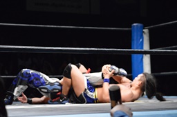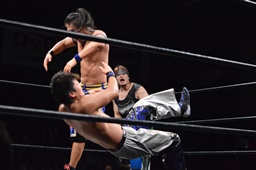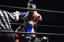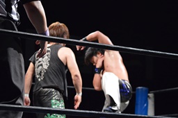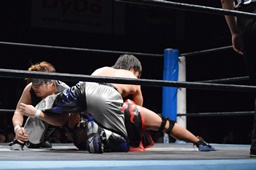HARASHIMAが彰人の上に(左写真)、ヒザ十字に。ウラノがHARASHIMAをカバー、カウント2。