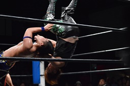 ファルコンアロー(左写真)、カウント2。HARASHIMAコーナーに振って串刺しビッグブーツ、ベンデュラム連打。