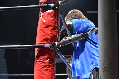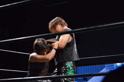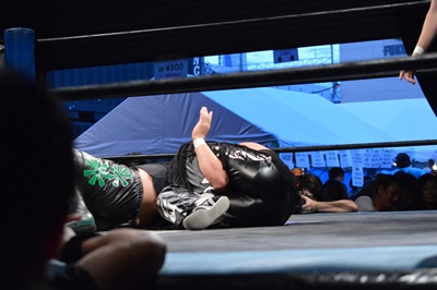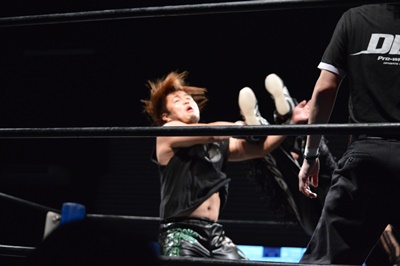 MIKAMIスワンダイブミサイルキックからスティンガー、ウラノロープ。MIKAMIスリーパー(右写真)、ウラノロープ。10分経過。