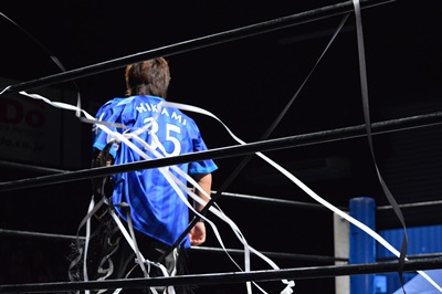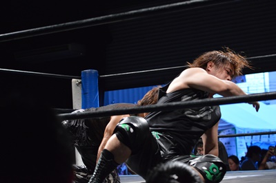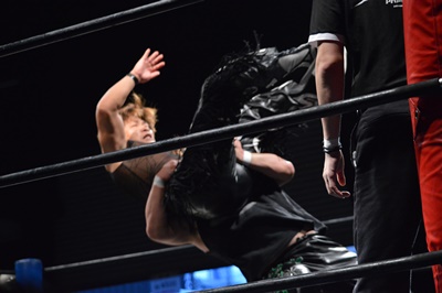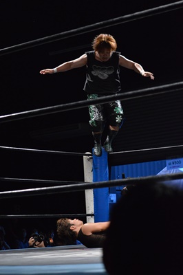 MIKAMIコーナーに上ってムーンサルトプレス、カウント2。再度コーナーに上ってスワントーンボム、ウラノかわして延髄蹴り。ウラノバックドロップ(左写真)。ウラノロープに飛ぶ、MIKAMIカウンターのデュランダルからスク〜ルボ〜イ、ウラノ押し潰してカウント3。
