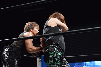 エルボー打ち合い、MIKAMIガットショットからブレーンバスター。MIKAMIキャッチ延髄はかわされるがバックキック(左写真)。