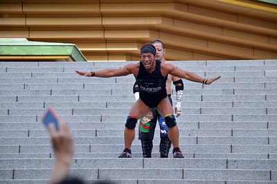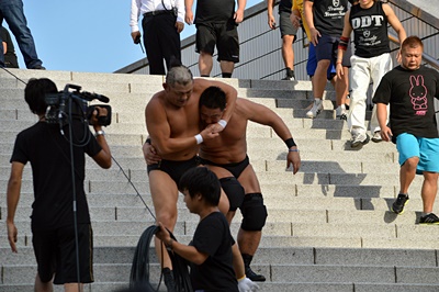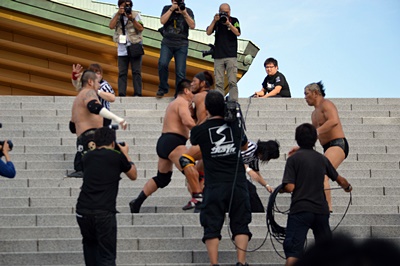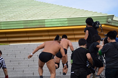 クレイジー大社長が国技館東の大階段に登場(右写真)。