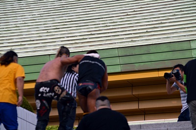 鈴木が高木にヘッドロック(左写真)、階段を下りる。