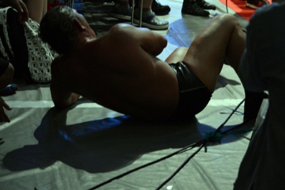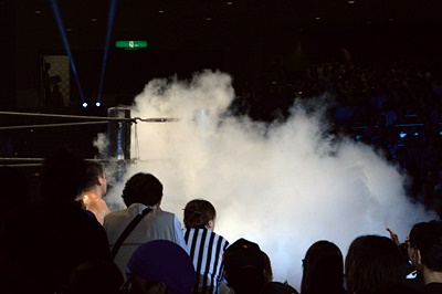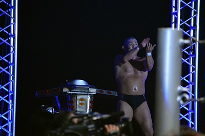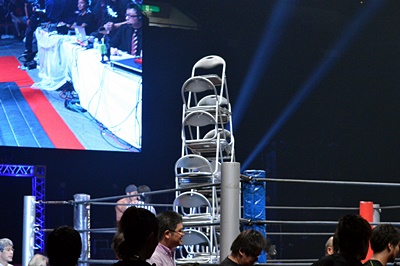 リング上には休憩中に組み上げられていた両国城(右写真)。