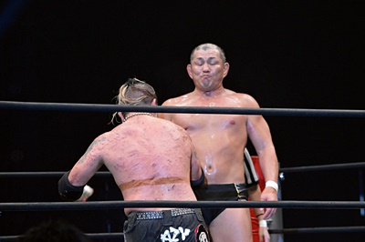 さすがの鈴木みのるもこれにはダウン(左写真)。