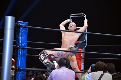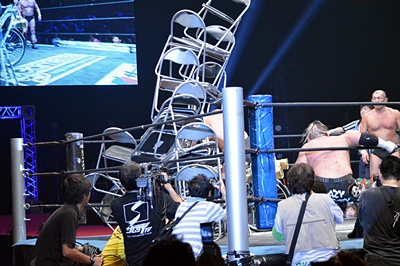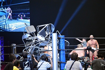 葛西がイス2脚持ち込み1脚鈴木に渡す。鈴木葛西にイス攻撃(左写真)、