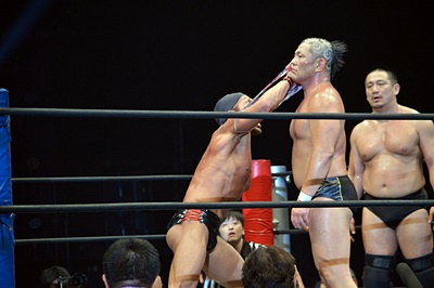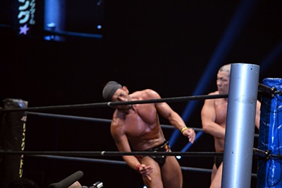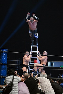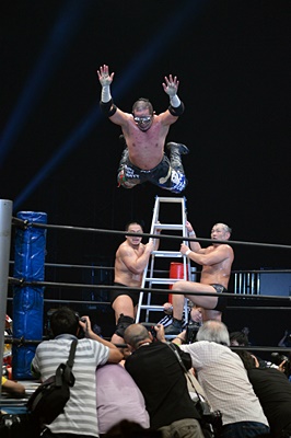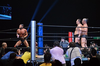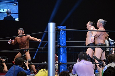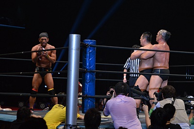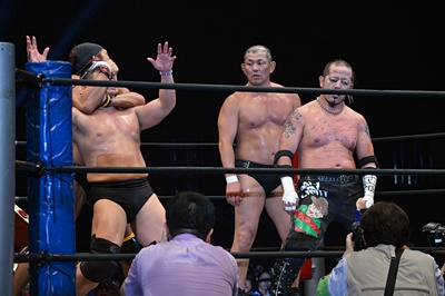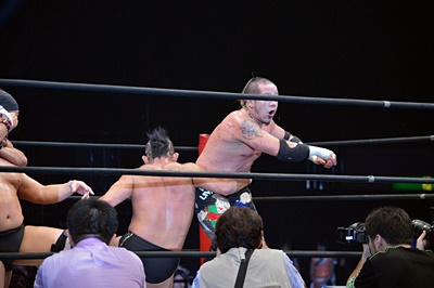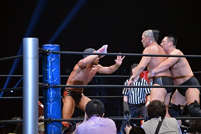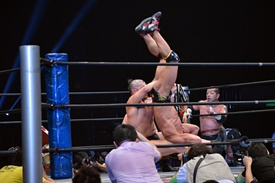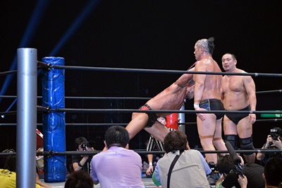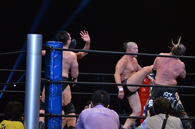 マイケルを場外に放り投げる葛西と鈴木(左写真)。