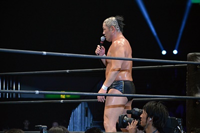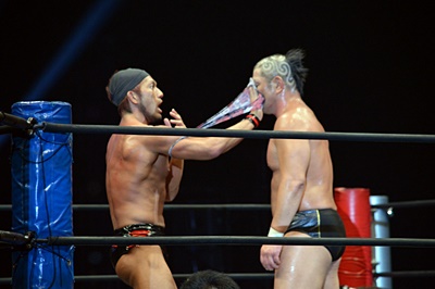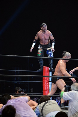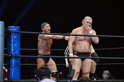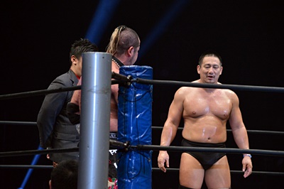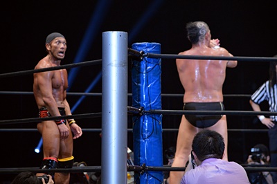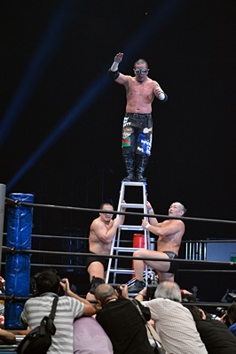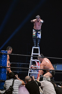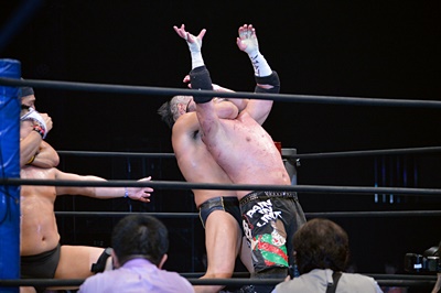エプロンに転がり出たマイケルを高木がぶっこぬきダブルアームスープレックスでリングに戻す(左写真)。