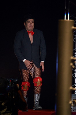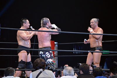 ここで高木から「重大発表」として「映画界進出、タイトルは『プロレスキャノンボール2014』、総監督はマッスル坂井、2015年2月公開予定」と。高木は鈴木、葛西にも出演要請(右写真)。