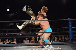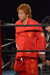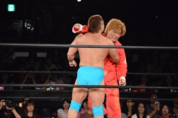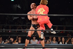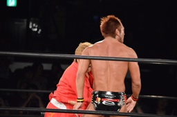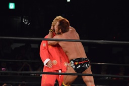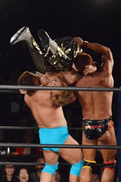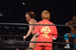 マイケルサミング(左写真)、松永にタッチ。松永チョップ、松野エルボー、松永チョップ、松野ダウン。松永はマイケルにタッチ。