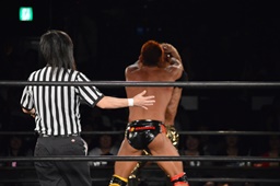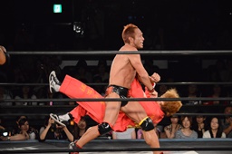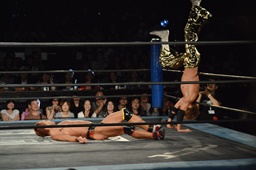 マイケルロープに飛ぶ、MIKAMIアームドラッグ連発(左写真)。