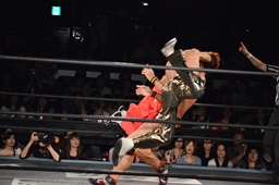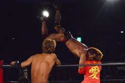 3発目松永がカウンターのトミーボンバー、MIKAMI一回転(右写真)。松永はマイケルにタッチ。