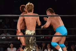 松野2人にエルボー連打、2人の首を抱え込む(左写真)。