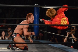 MIKAMIガットショット、ヘッドロック、マイケルロープに振る、MIKAMIショルダーブロック(右写真)。