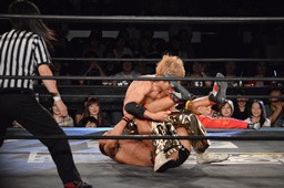 ハイファイヴエルボードロップ(左写真)、松野がカバー、カウント2。