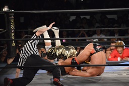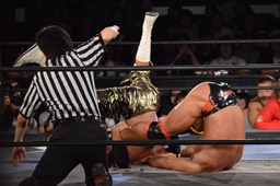 3カウント寸前で松野がわずかに肩を上げ(左写真)マイケルのみがカウント3。