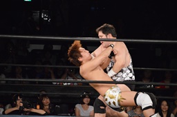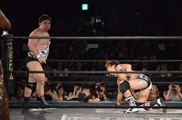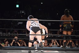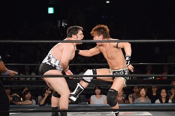 先発はアントンと平田。ロックアップ、ブレーク。ロックアップ、平田ヘッドロック、アントン切り返してヘッドロック。平田ロープに振る、アントンショルダーブロック(左写真)。