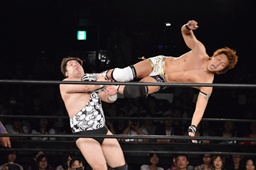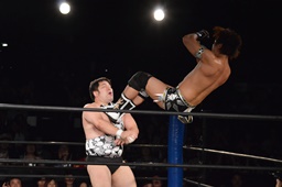 アントンロープに飛ぶ、平田はリープフロッグからドロップキック(右写真)。