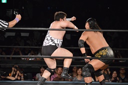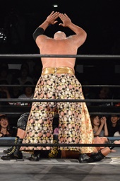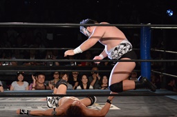 コーナーに上ってミサイルキック(右写真)、カウント2。