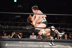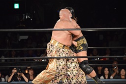 平田ロープに振る、アントン切り返してテーズプレス(左写真)からフォアアームドロップ、カウント2。