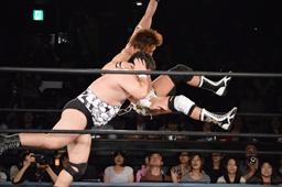 アントンロープに飛ぶ、平田カウンターの低空ドロップキック(左写真)。