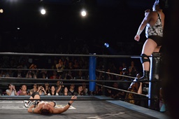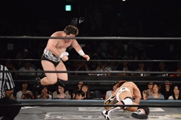 そしてダイビングフィストドロップ(左写真)、カウント3。
