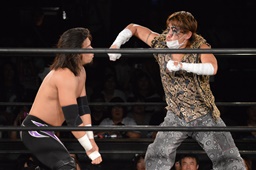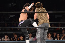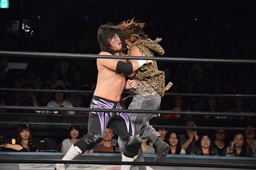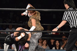 ロープに振ってバックエルボー(左写真)、カウント2。