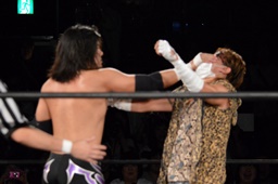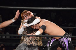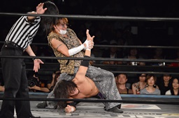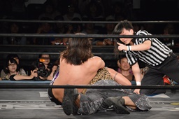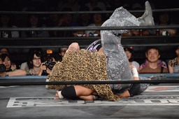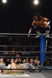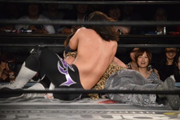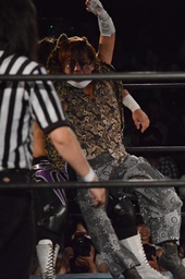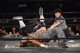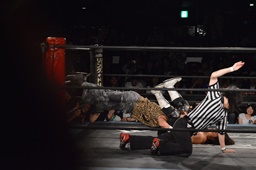 佐々木ロープに振ってドロップキック、ニラスカすとロープに足を掛けてエビ固め(右写真)、木曽レフェリー気づいてカウント止める。