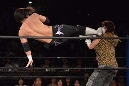 ニラロープに飛ぶ、佐々木カウンターのドロップキック(右写真)。