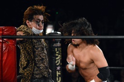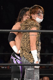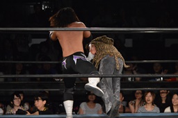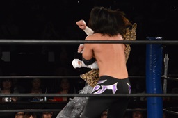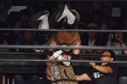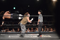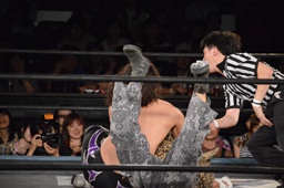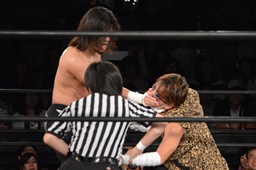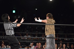 佐々木は木曽レフェリーに抗議するニラの後頭部にドロップキック(左写真)。