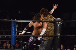 佐々木ニラをリングに戻すとコーナーに上って(右写真)、