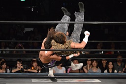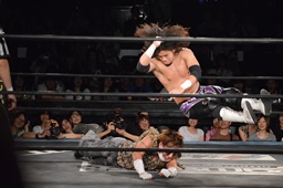 佐々木コーナーに上ってダイビングエルボードロップ狙う。