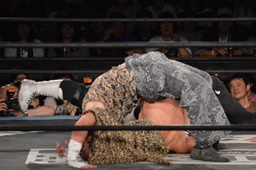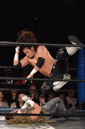 佐々木コーナーから下りてエルボードロップ、ニラ転がってかわそうとするが(左写真)、背中にヒット。