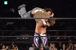 佐々木バックドロップ(左写真)、カバー、ニラ腹筋で起き上がる、カウント2。