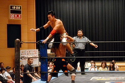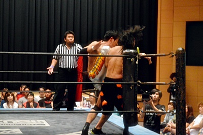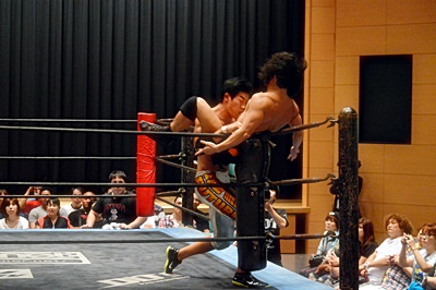 竹下強引に上げる、高梨背中につかまってスリーパーに(左写真)、竹下はコーナーに下がってブレーク。