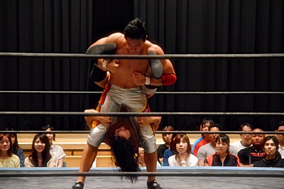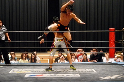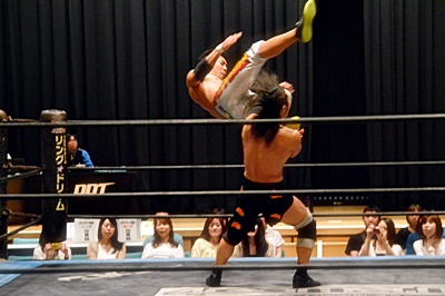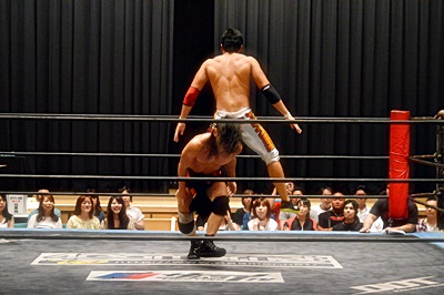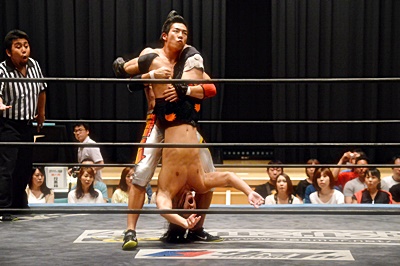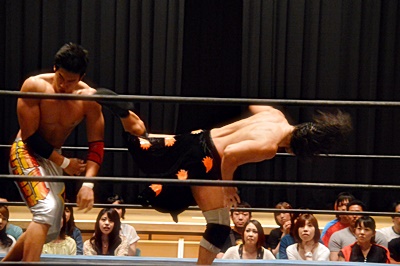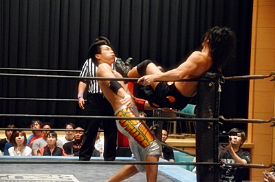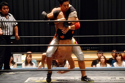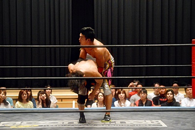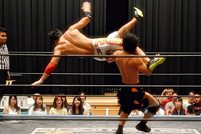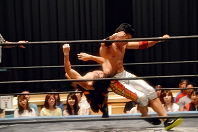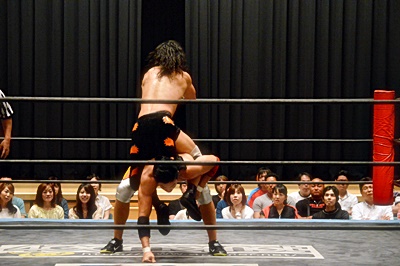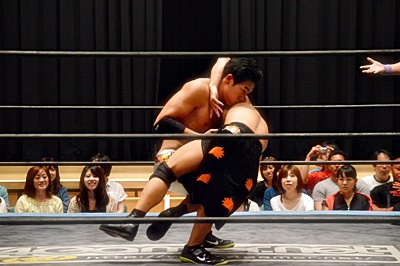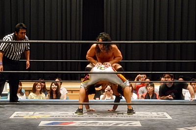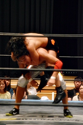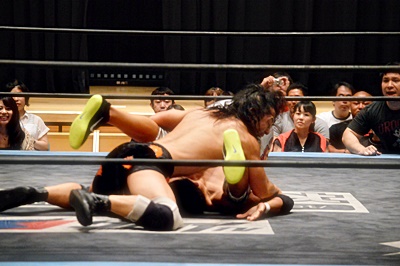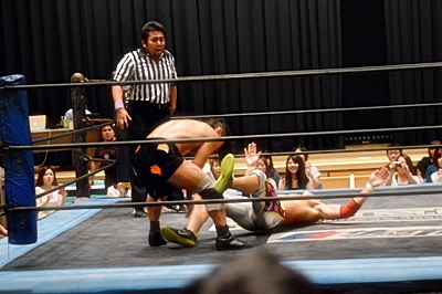 足を取りに来た竹下を高梨丸め込んで(左写真)、カウント3。