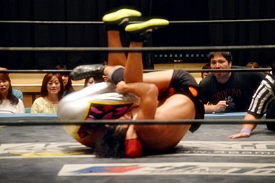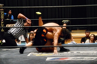 高梨首固め3連発(右写真)、いずれもカウント2。