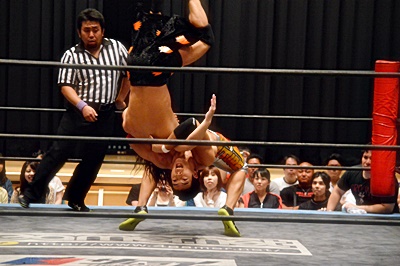 開脚して高梨を飛び越えさせようとするが高梨は押さえ込む(右写真)、カウント2。