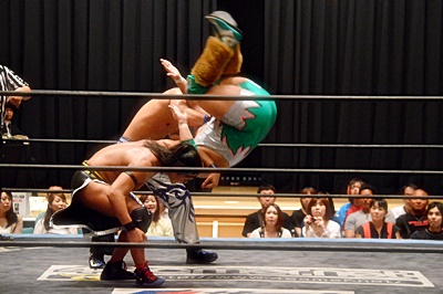 石井ソバット、ボディスラムからサマーソルトドロップ(右写真)、カウント2。入江にタッチ。