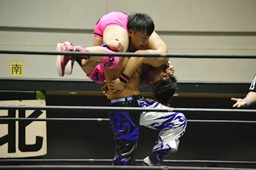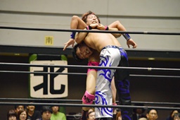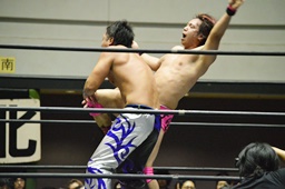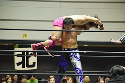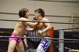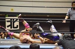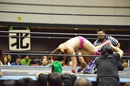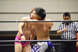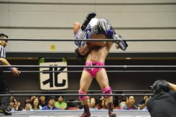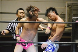 石井グリップ離さずまたダブルアーム、HARASHIMA両足を石井のボディに引っ掛ける(左写真)、