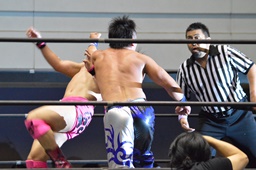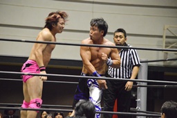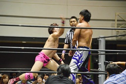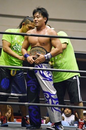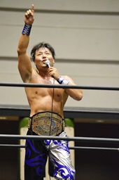 「今日はたくさんのご来場ありがとうございます。DDT、今どんどん突っ走っています。次の11月の大阪大会も絶対に勝ってやるさー!ベルトをしっかり巻いてきてやるさー!そしてさいたまスーパーアリーナまで突っ走ってやるさー!上(第1競技場)にも行ってやるさー!」(右写真)