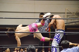 HARASHIMAつるべ落とし狙うが石井は着地してビッグブーツ(右写真)、